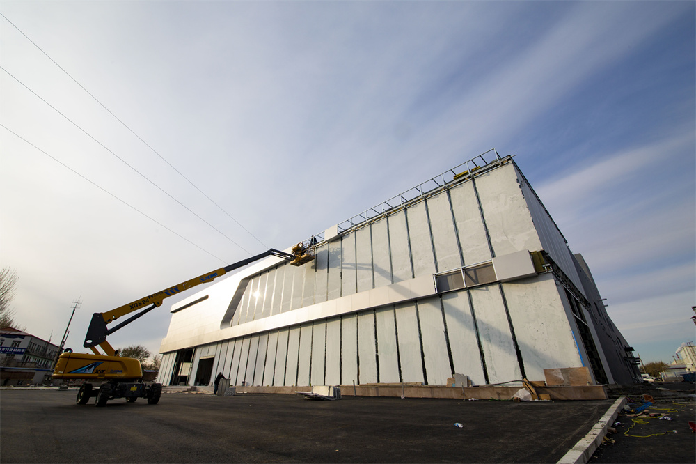 項目特點:該項目銷售區(qū)為鋼框架結(jié)構(gòu),維修區(qū)為門式鋼架結(jié)構(gòu)。鋼框架部分結(jié)構(gòu)夾層多種標高,增加了現(xiàn)場施工難度。屋面局部設(shè)置高位水箱間。維修區(qū)部分為34.61m跨度無中柱門式鋼架結(jié)構(gòu),內(nèi)部設(shè)置多個夾層梁,屋面保溫為玻璃絲綿現(xiàn)場復合板,屋面外板均為475型360°咬合連接板。墻體均為士建墻體。